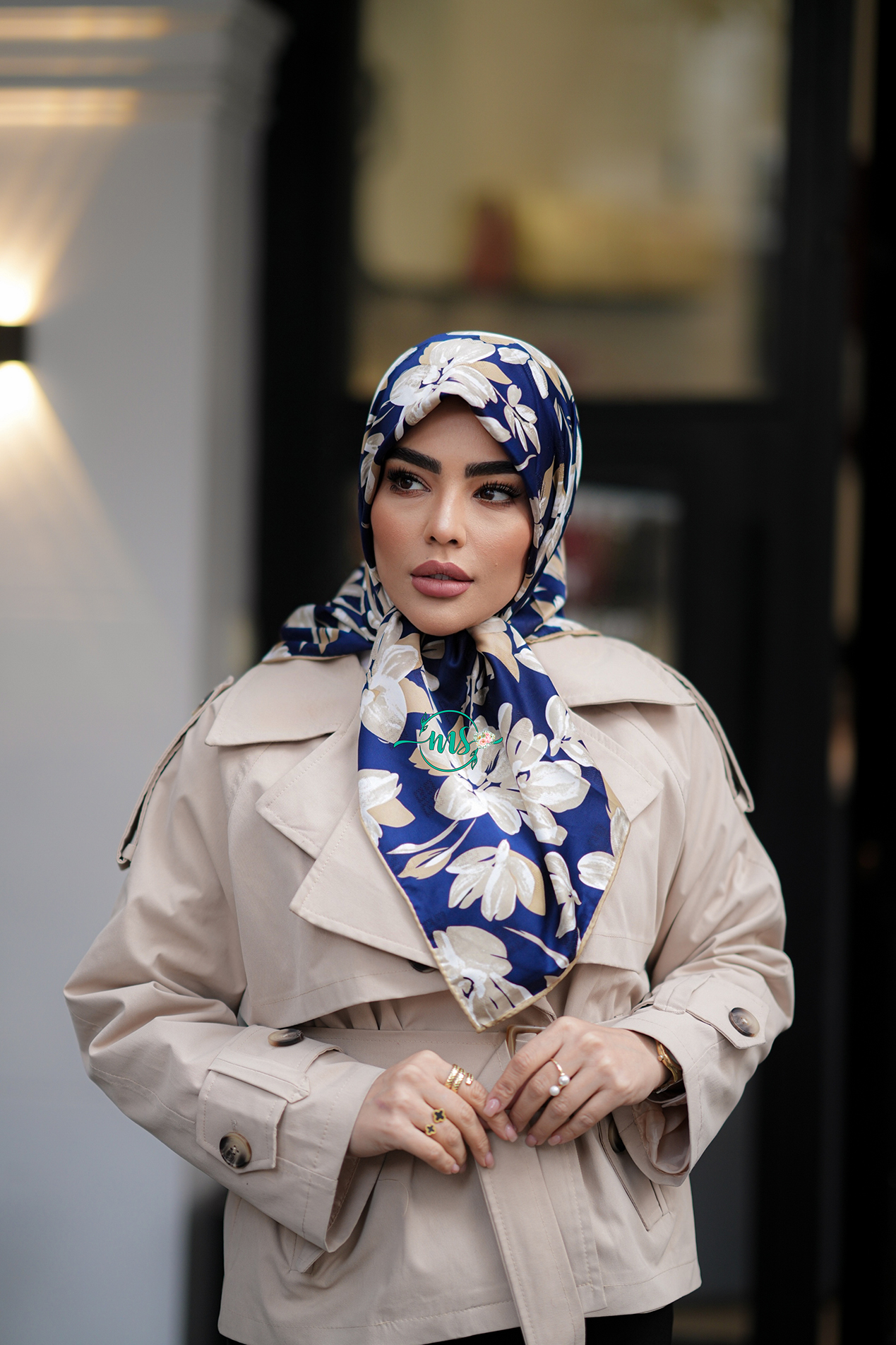 روسری ابریشم ژاکارد طرح گل رنگ سرمه ای