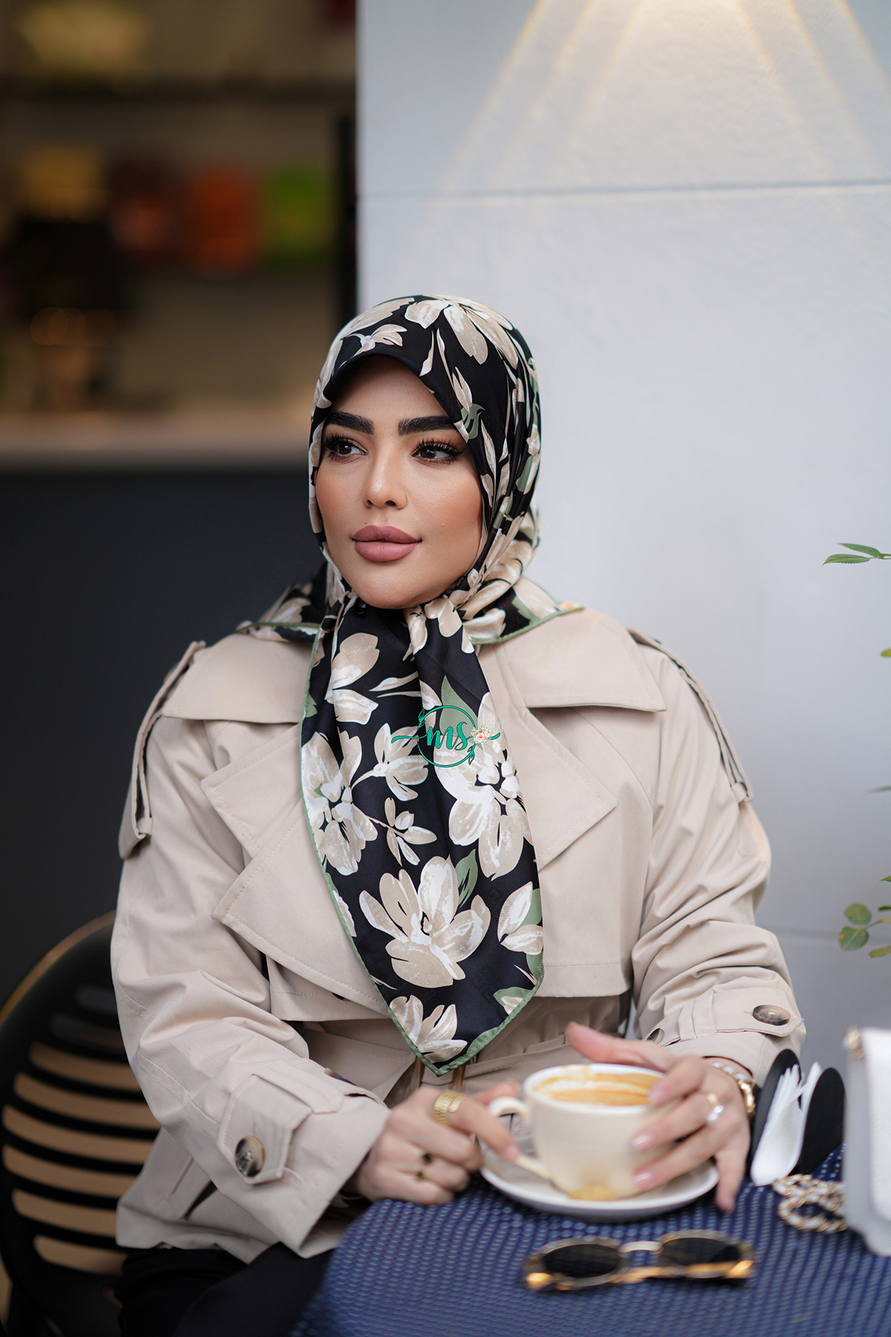 روسری ابریشم طرح گل جیوانجی رنگ مشکی کرم سبز