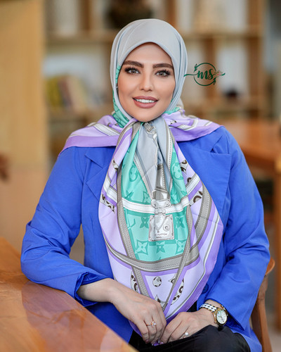 روسری ابریشم کجراه طرح کارتیه سبز زیتونی بنفش
