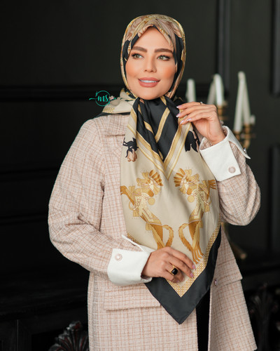 روسری ابریشم کجراه طرح هرمس چند رنگ مشکی طلایی