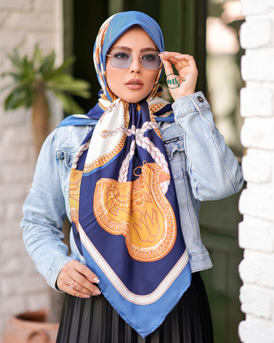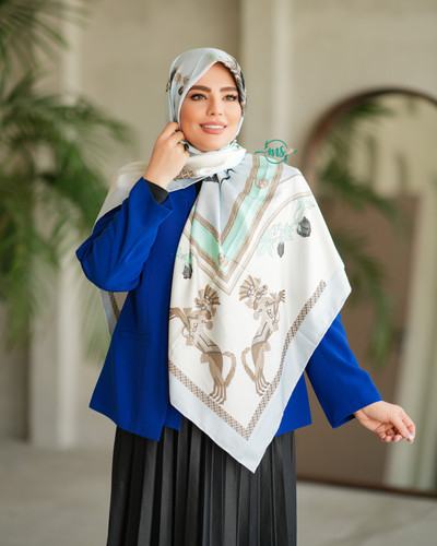 روسری ابریشم کجراه طرح هرمس چند رنگ آبی