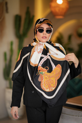 روسری ابریشم ژاکارد طرح لاکچری مشکی نارنجی