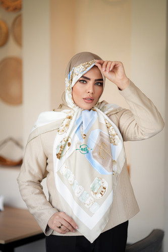 روسری ابریشم کجراه طرح کارتیه کرم آبی