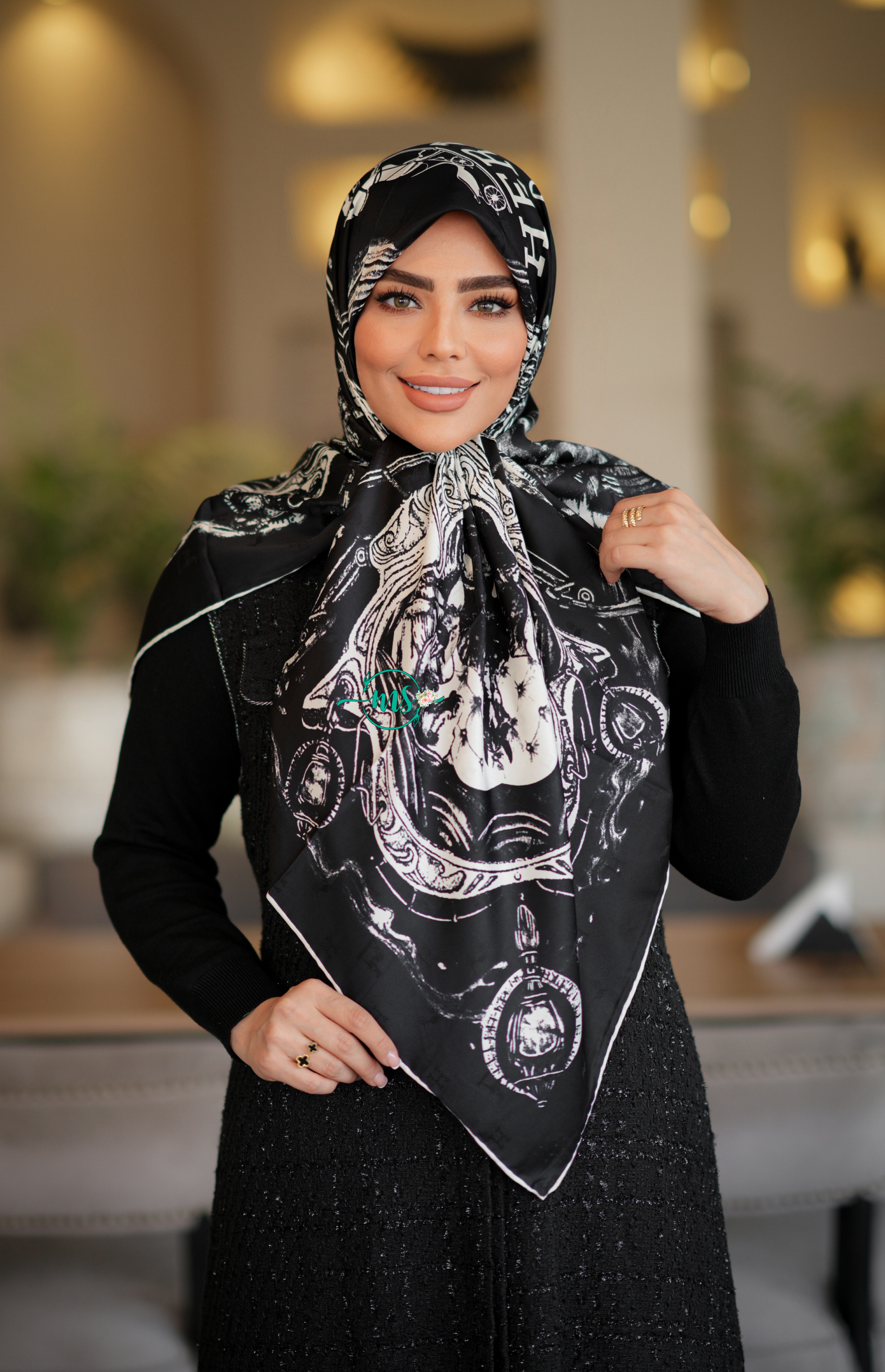 روسری ابریشم ژاکارد طرح لاکچری مشکی سفید