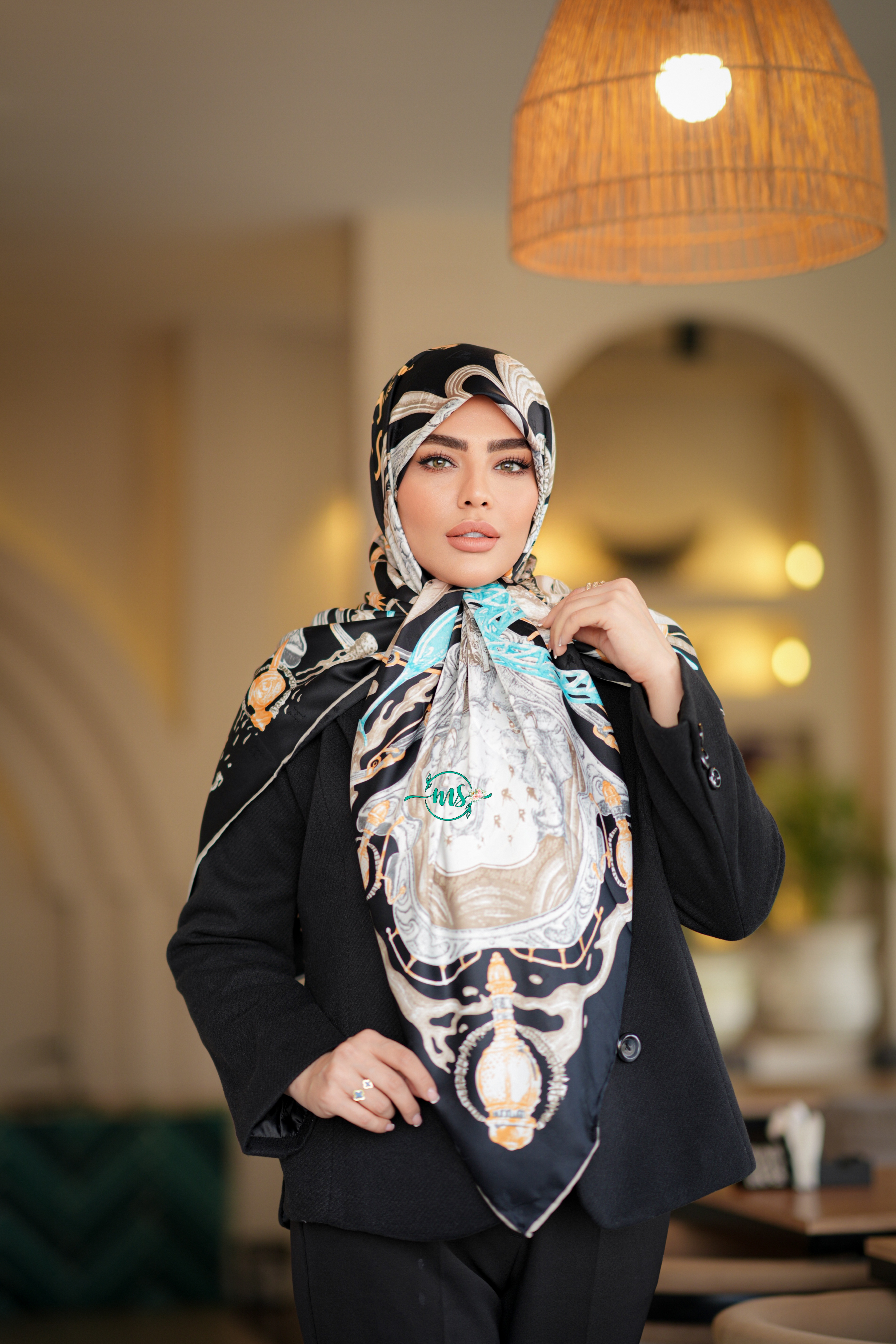 روسری ابریشم ژاکارد طرح لاکچری مشکی نارنجی