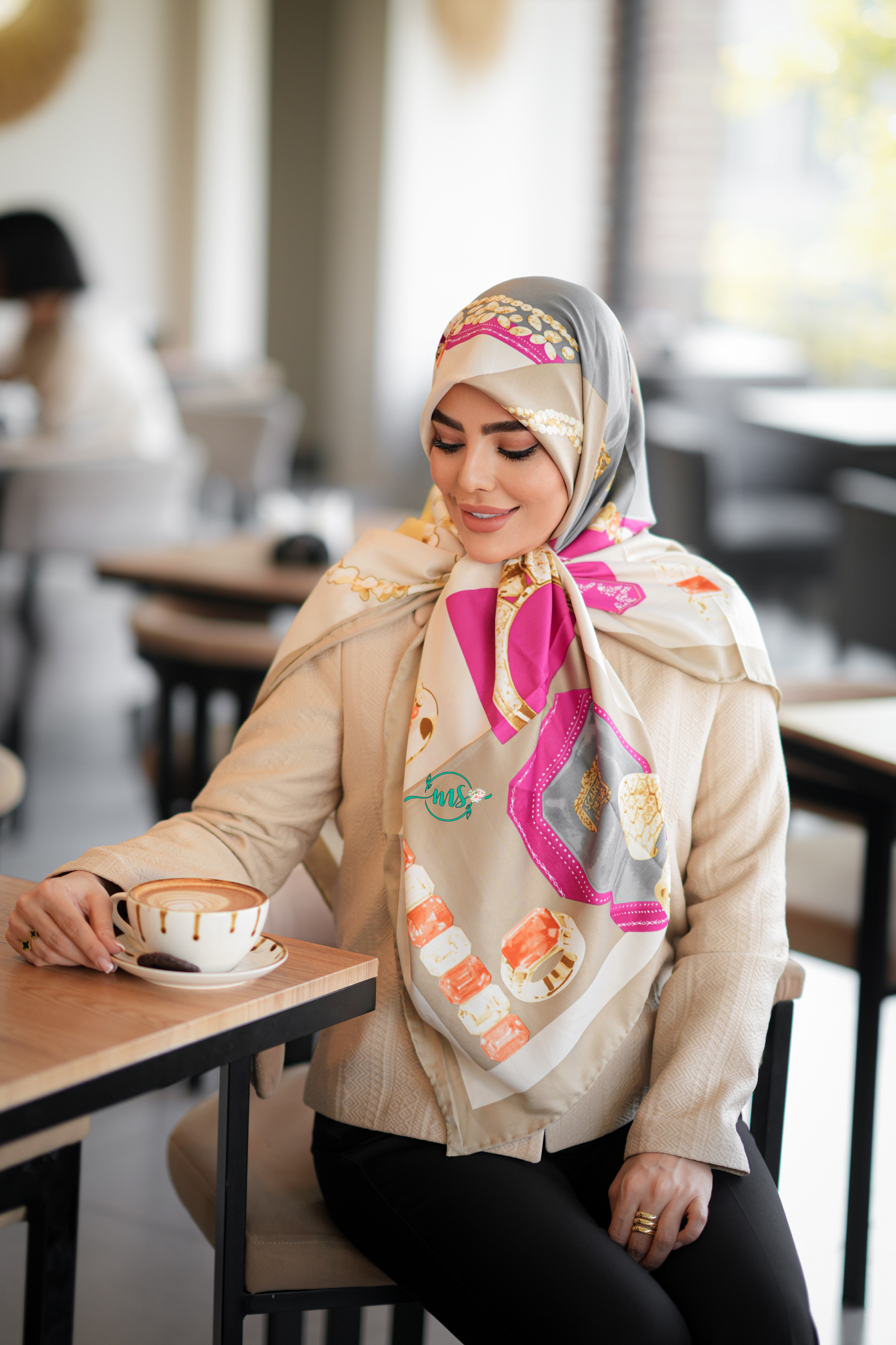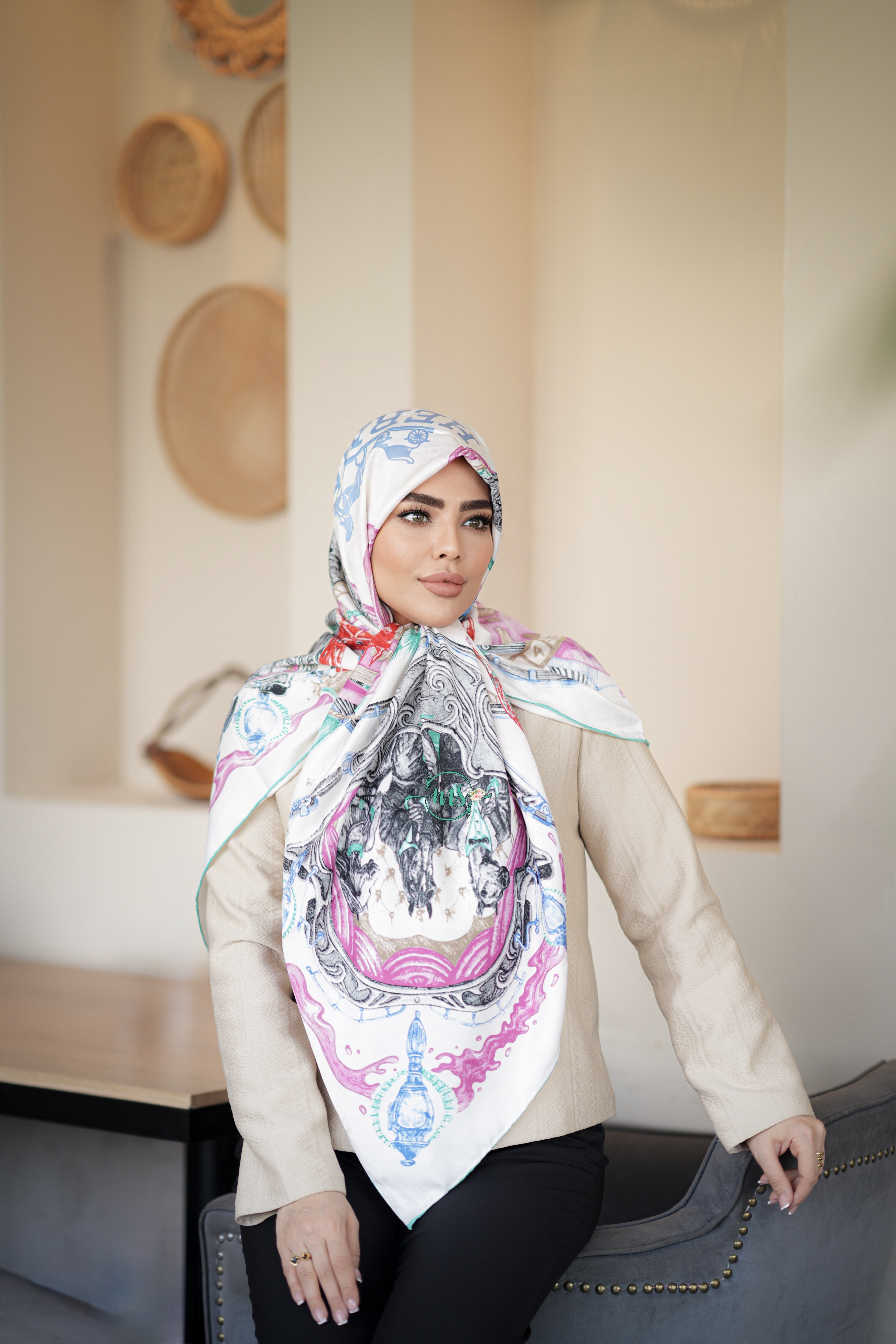روسری ابریشم ژاکارد طرح لاکچری سفید صورتی