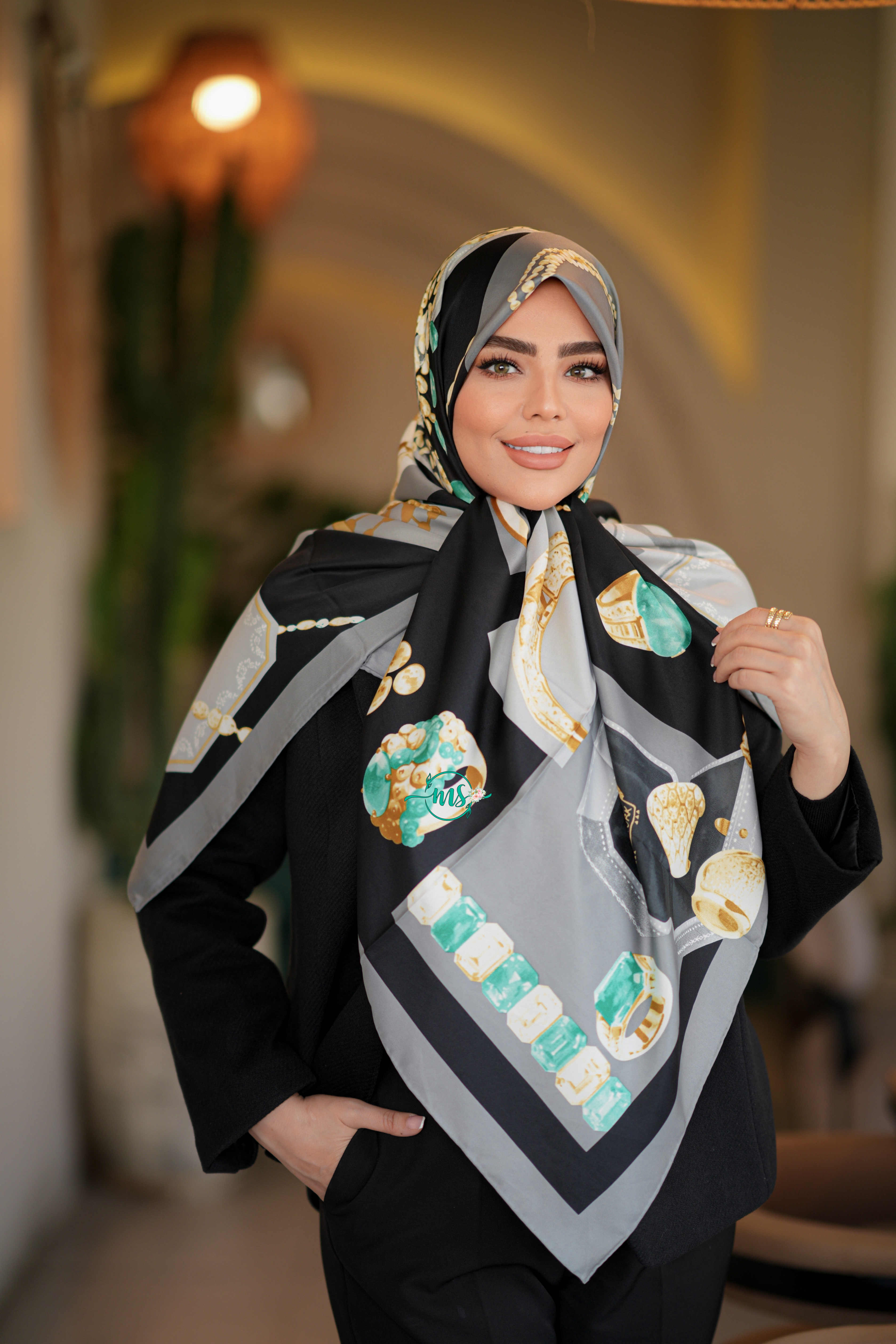 روسری ابریشم کجراه طرح کارتیه مشکی طوسی سبز