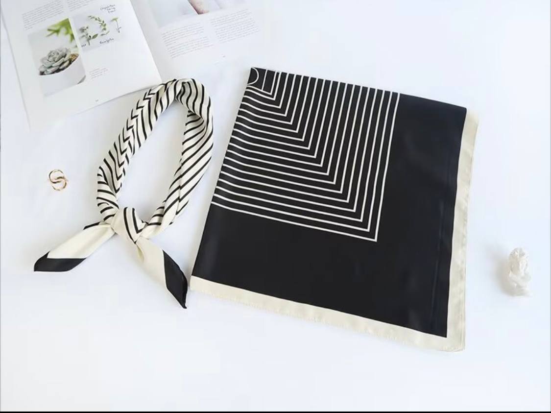 روسری ابریشم کجراه طرح کارتیه سفید مشکی