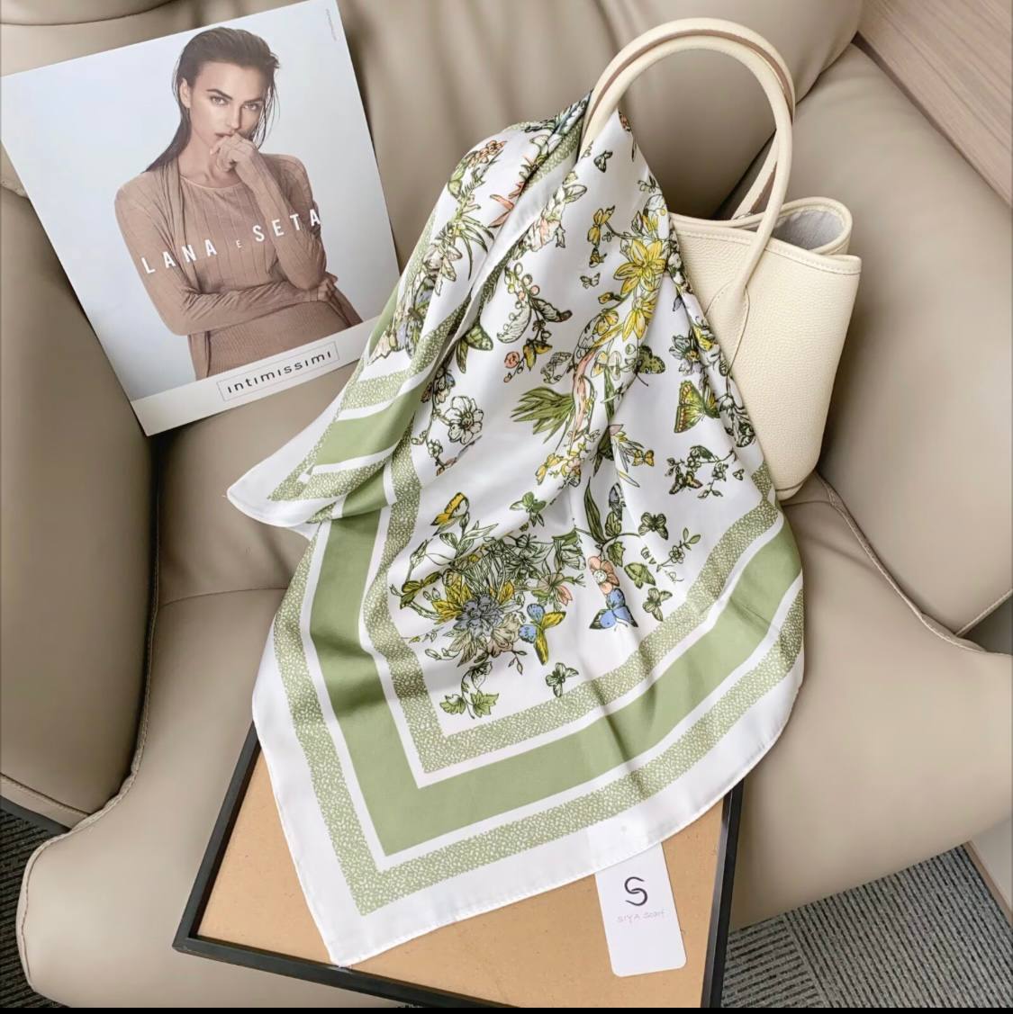 روسری ابریشم ژاکارد طرح لاکچری سبز زیتونی روشن