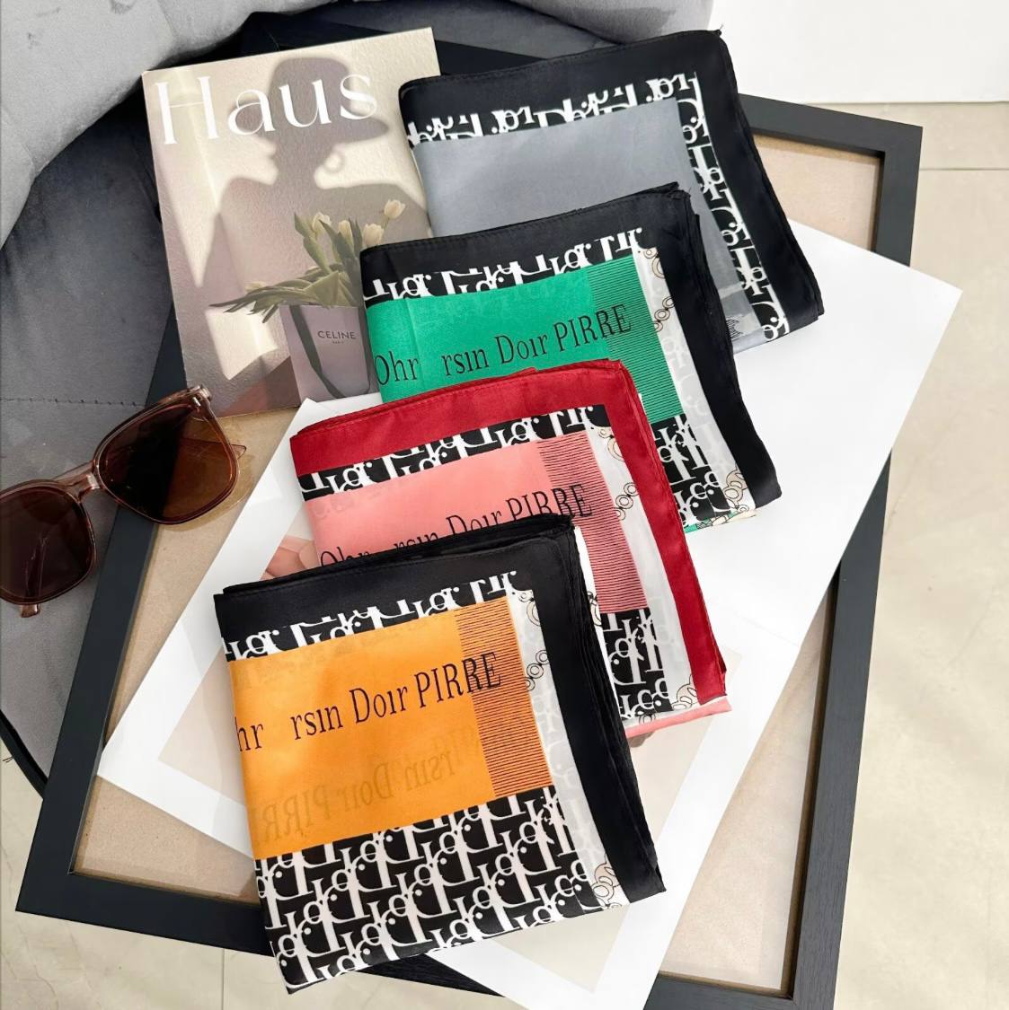روسری ابریشم ژاکارد طرح دیور قاب قابی مشکی قرمز