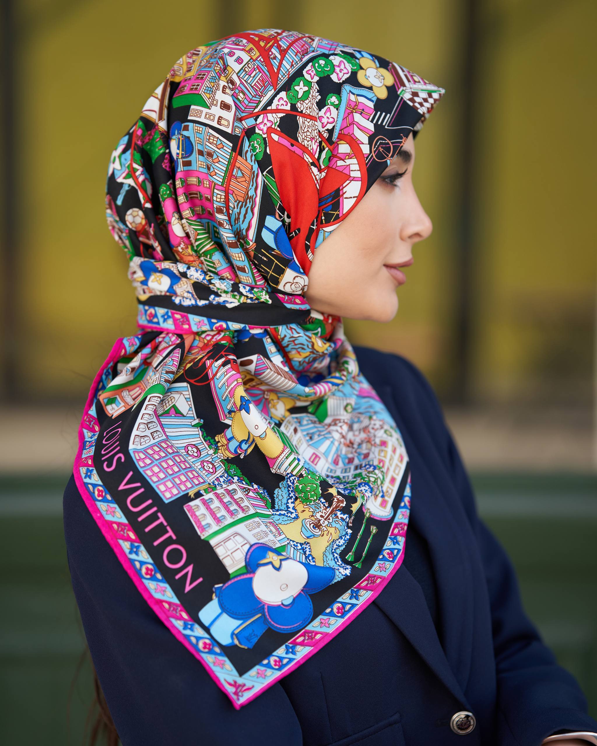 روسری ابریشم طرح شنل رنگ مشکی سرخابی