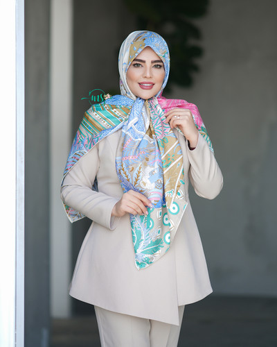 ناموجودروسری ابریشم ژاکارد طرح آتن شیری آبی