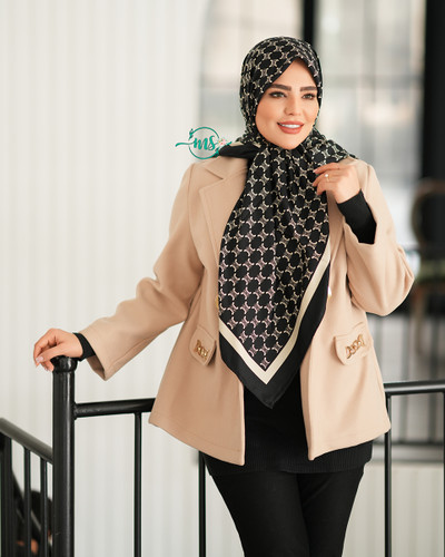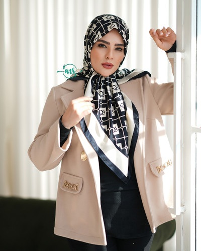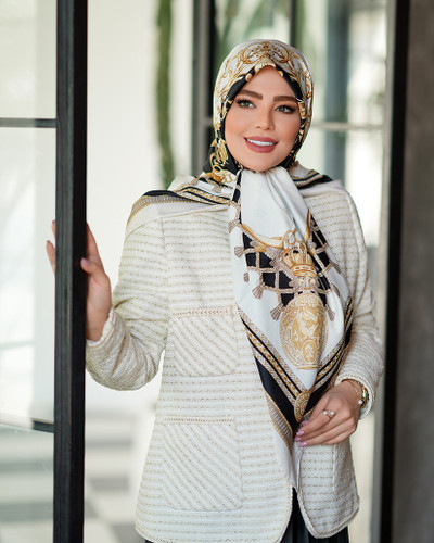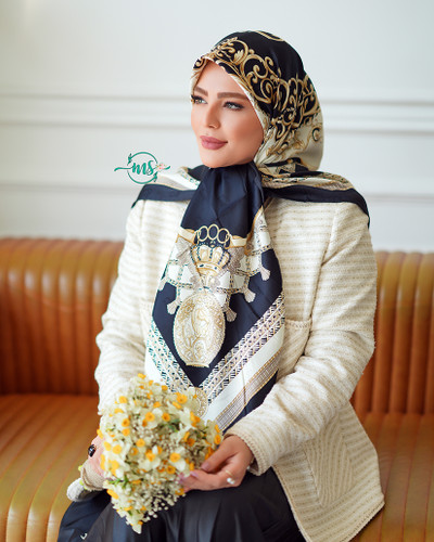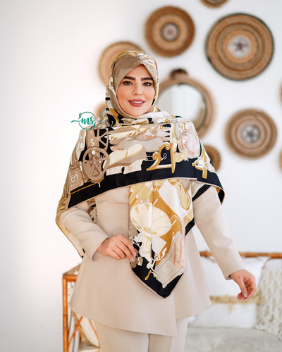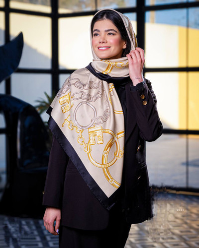 روسری ابریشم ژاکارد طرح شنل مشکی کرم 1