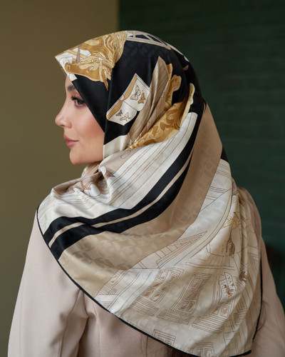 روسری ابریشم ژاکارد طرح تروا مشکی کرم