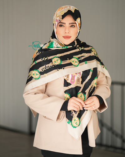 روسری ابریشم ژاکارد طرح شنل کیف مشکی کرم
