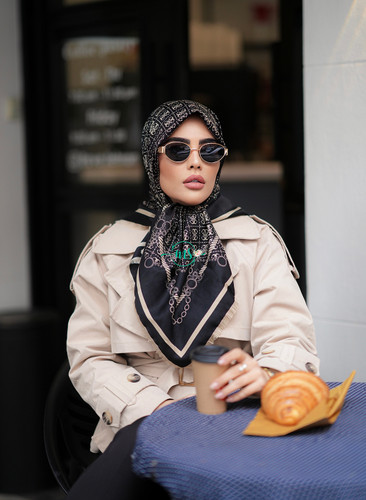 روسری ابریشم ژاکارد طرح زنجیری رنگ مشکی کرم