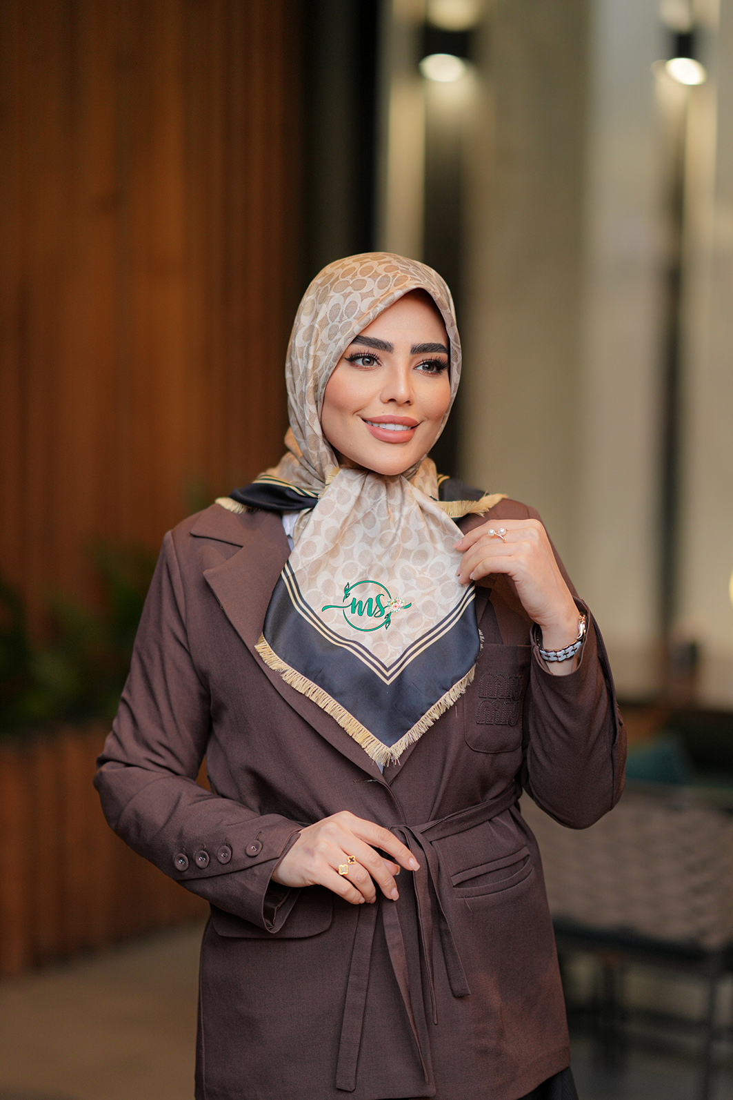 روسری ابریشم ژاکارد طرح شنل مشکی کرم تیره