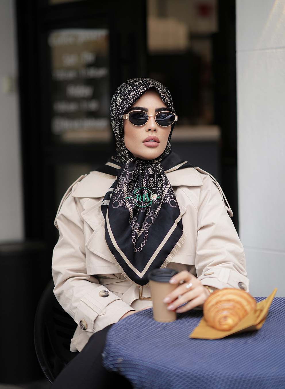 روسری ابریشم طرح شنل رنگ مشکی کرم تیره