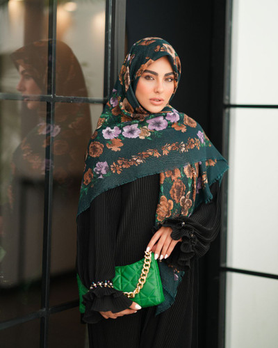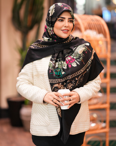 روسری ابریشم ژاکارد طرح گل شنل مشکی سبز