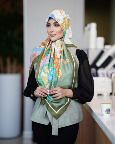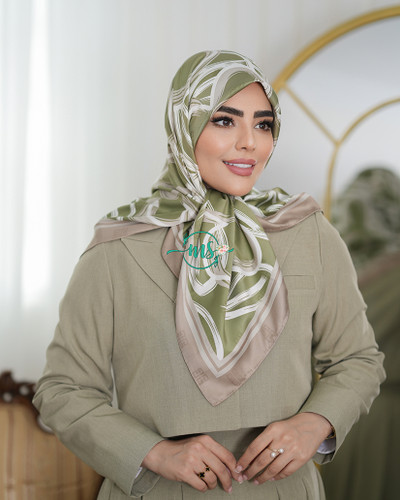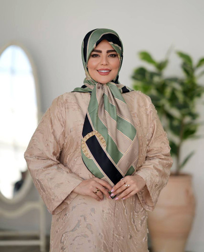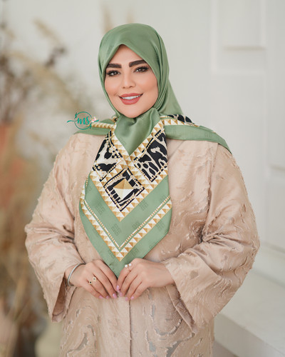 روسری ابریشم ژاکارد طرح قاب سبز موکا