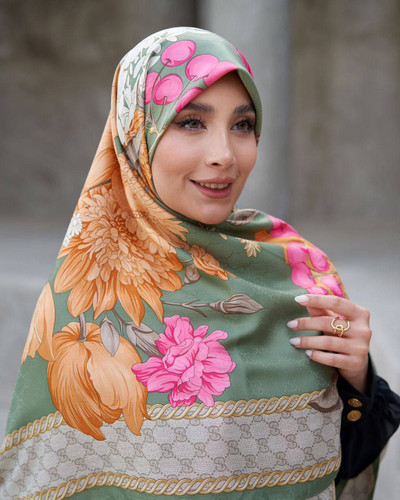 روسری ابریشم کجراه گل گوچی سرخابی سبز