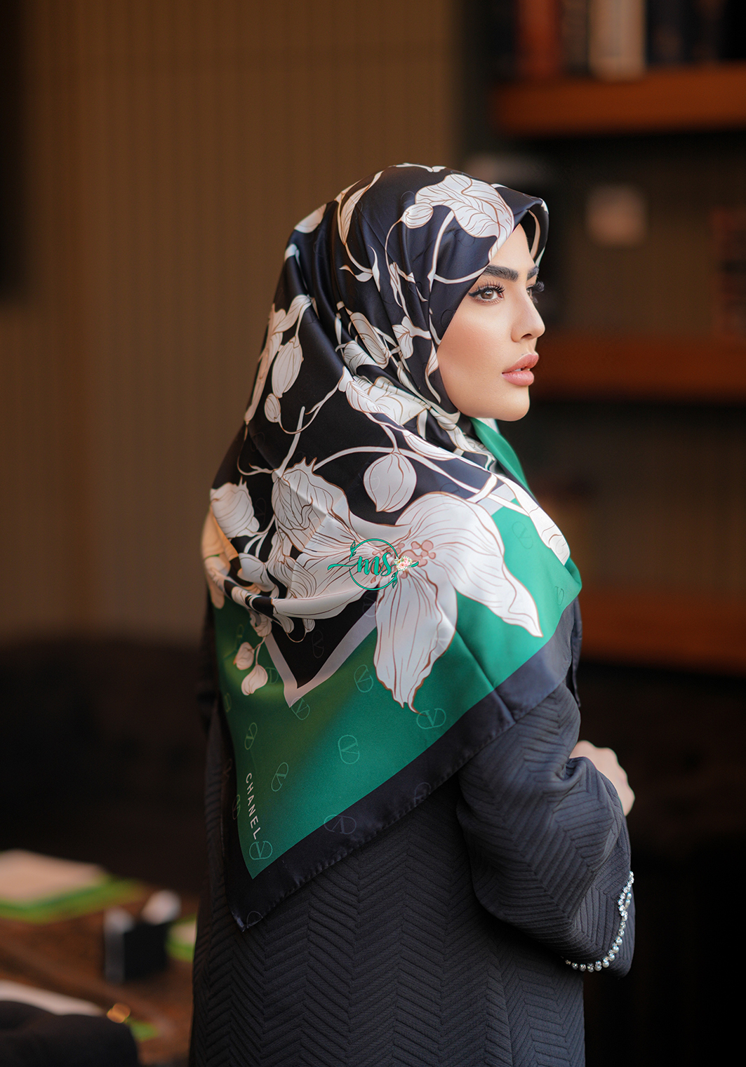روسری ابریشم ژاکارد طرح گل شنل مشکی سبز