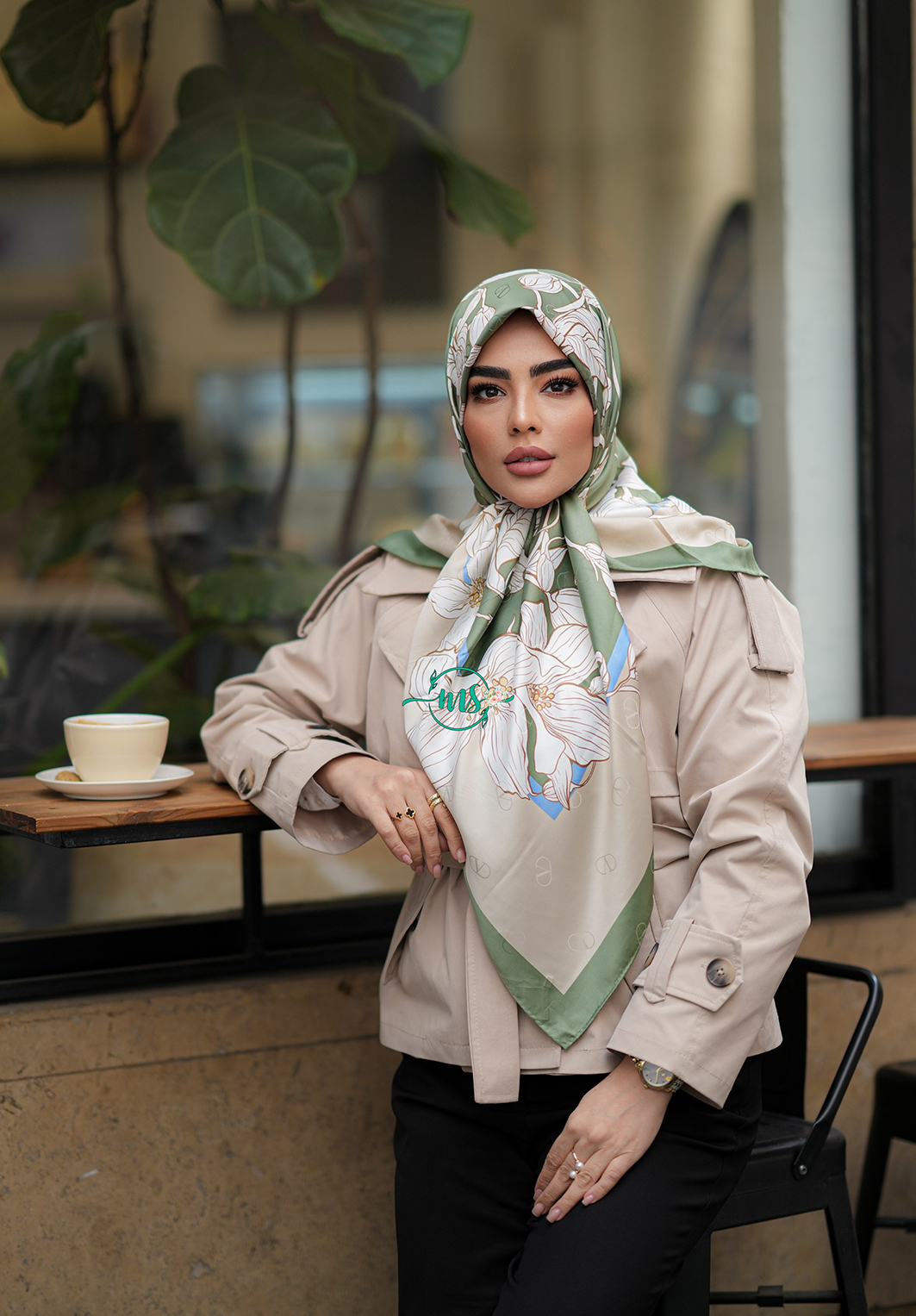 روسری ابریشم ژاکارد طرح گل والنتینو رنگ سبز کرم