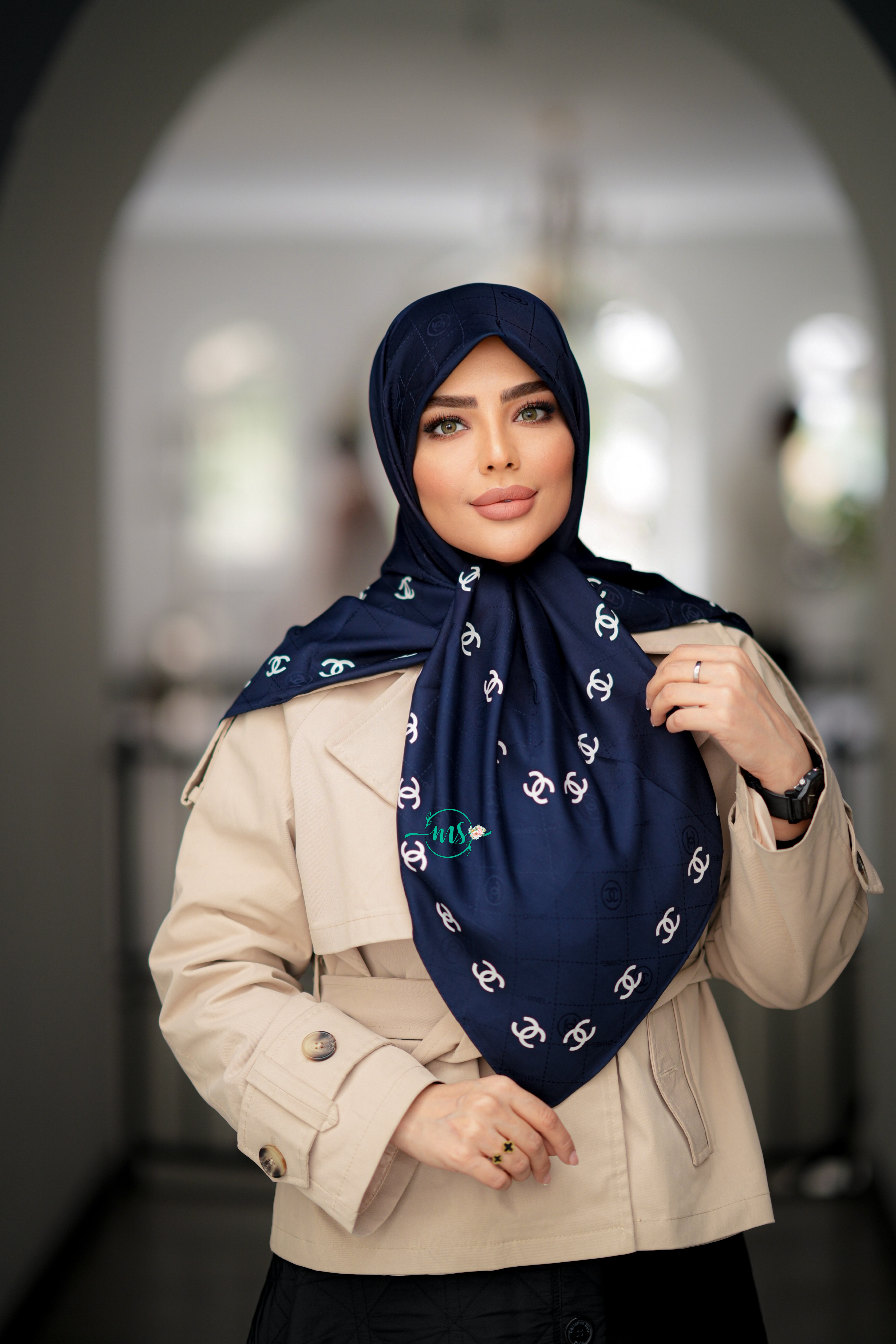 روسری ابریشم ژاکارد طرح شنل حاشیه مارک سرمه ای
