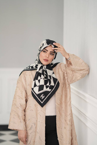 روسری ابریشم ژاکارد طرح شنل مشکی سفید