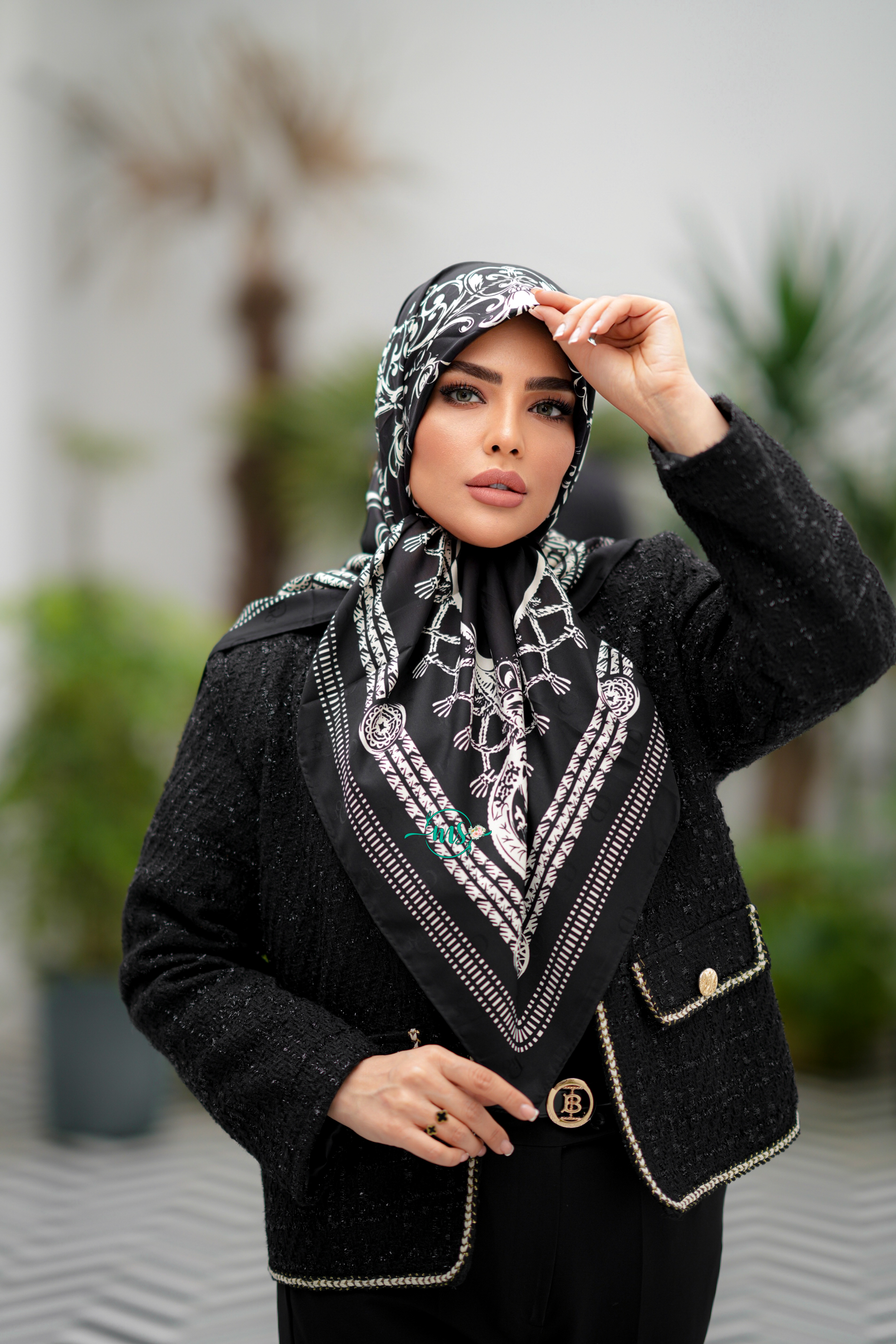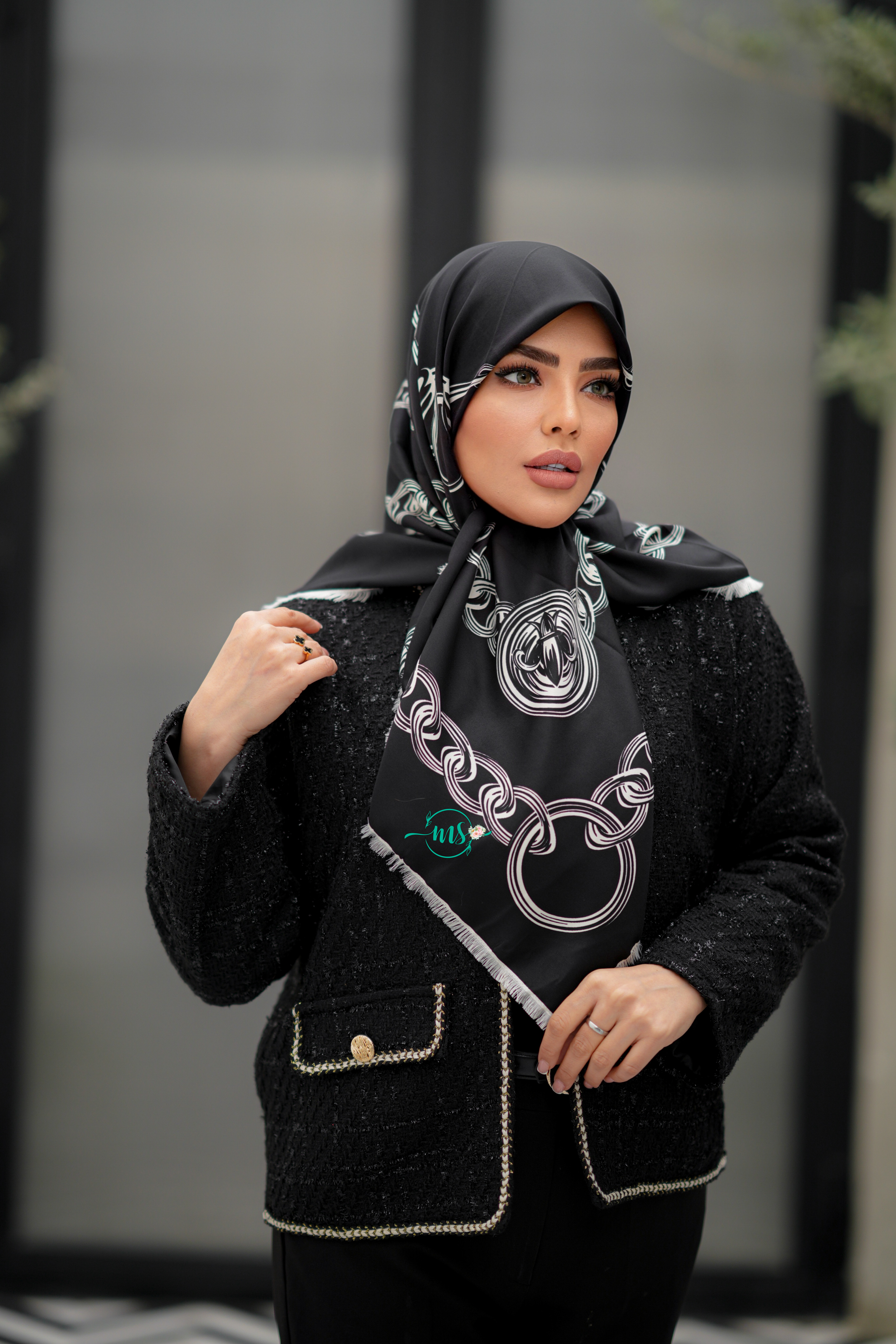 روسری ابریشم ژاکارد طرح لاکچری مشکی سفید