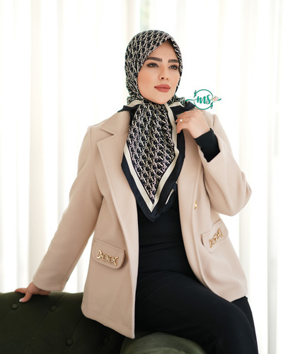 روسری ابریشم ژاکارد طرح مربع مشکی کرم