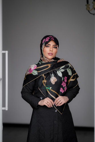 روسری ابریشم ژاکارد طرح گل رز دیوررنگ مشکی طلایی