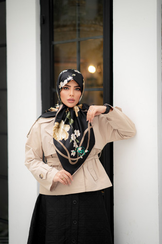 روسری طرح دیور مربعی مشکی حاشیه کرم