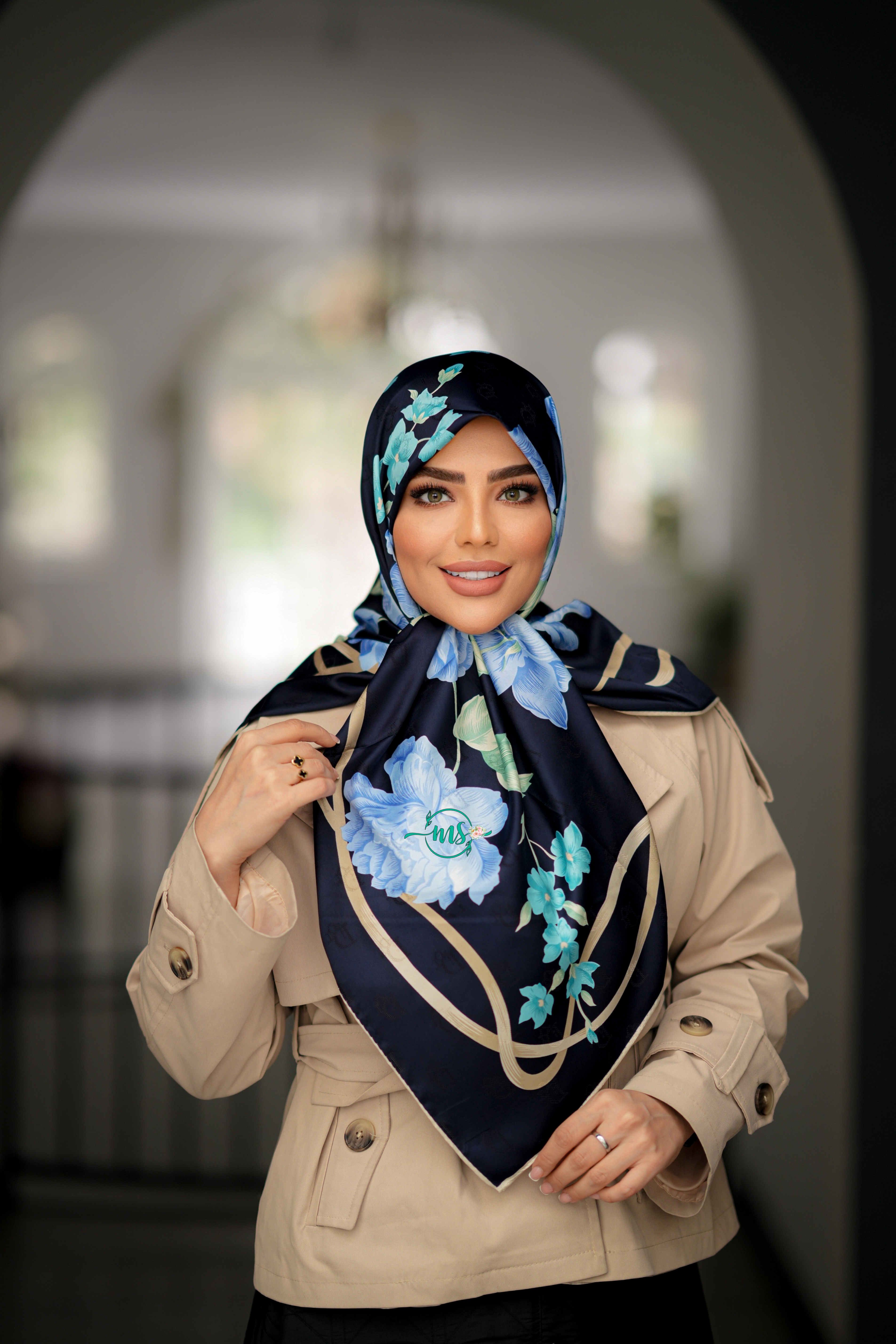 روسری ابریشم ژاکارد طرح گل شنل سرمه ای آبی