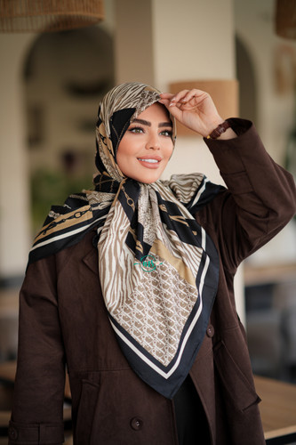 روسری ابریشم ژاکارد طرح چریکی مشکی شکلاتی حاشیه کرم