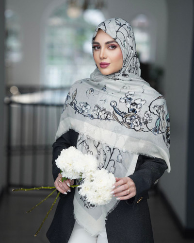 روسری نخ یونیک طرح بلوبری طوسی کمرنگ
