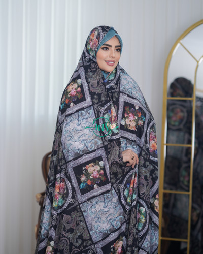 چادر نماز کیسه ای کدری 76 زمینه مشکی آبی صورتی