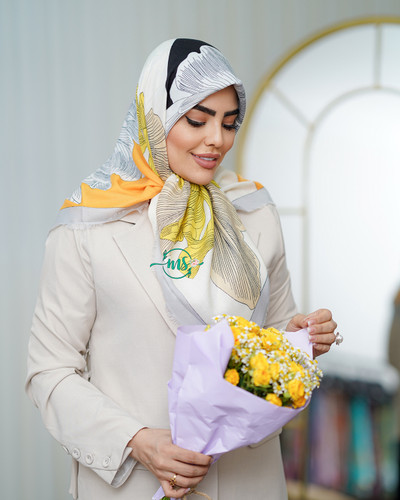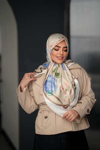 روسری ابریشم ژاکارد طرح گل رنگ کرم