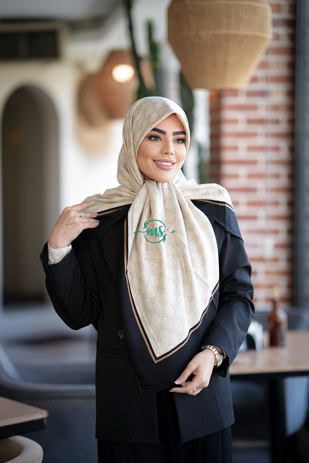 روسری ابریشم ژاکارد طرح شنل مشکی کرم 1