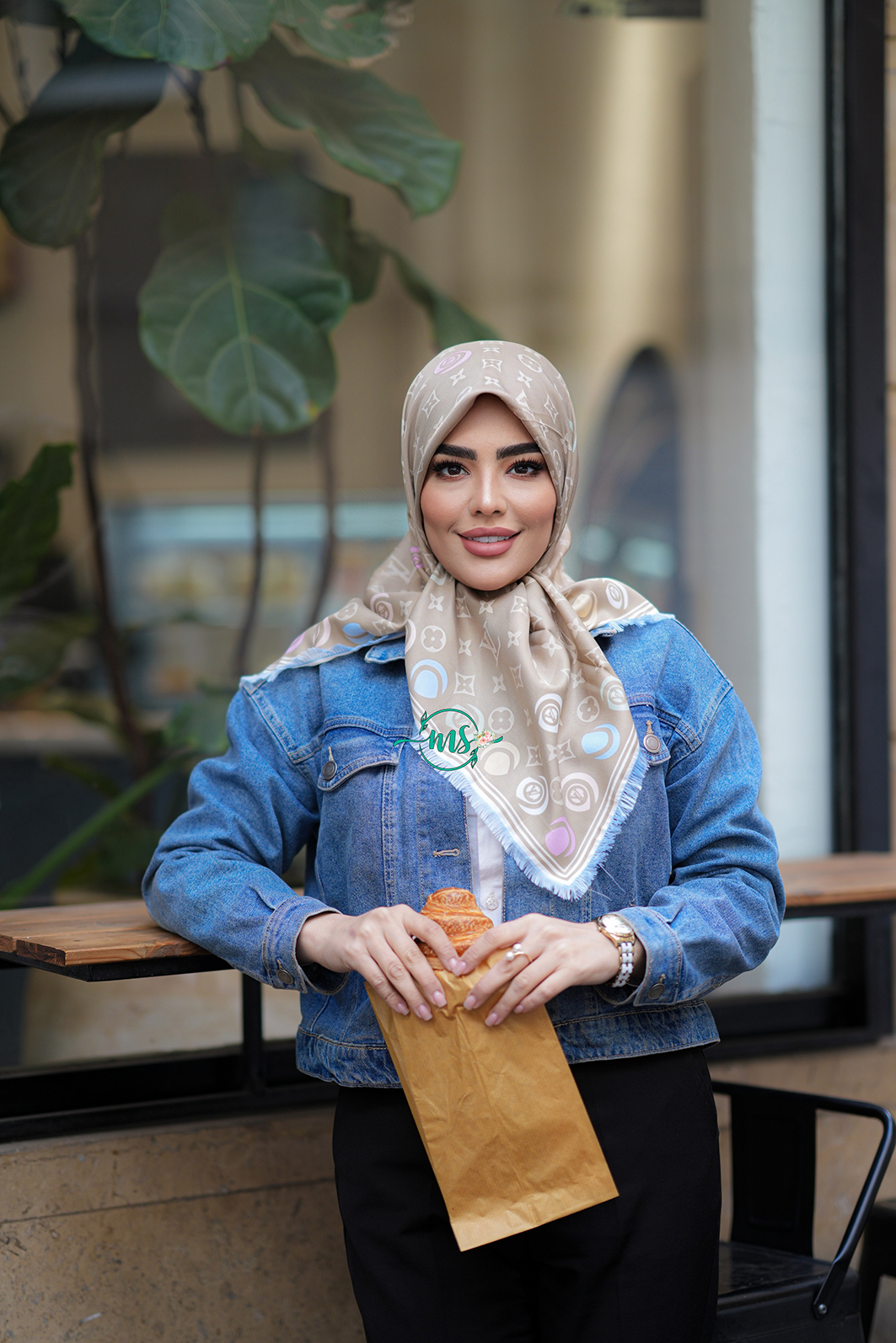 روسری طرح دیور مربعی مشکی حاشیه کرم