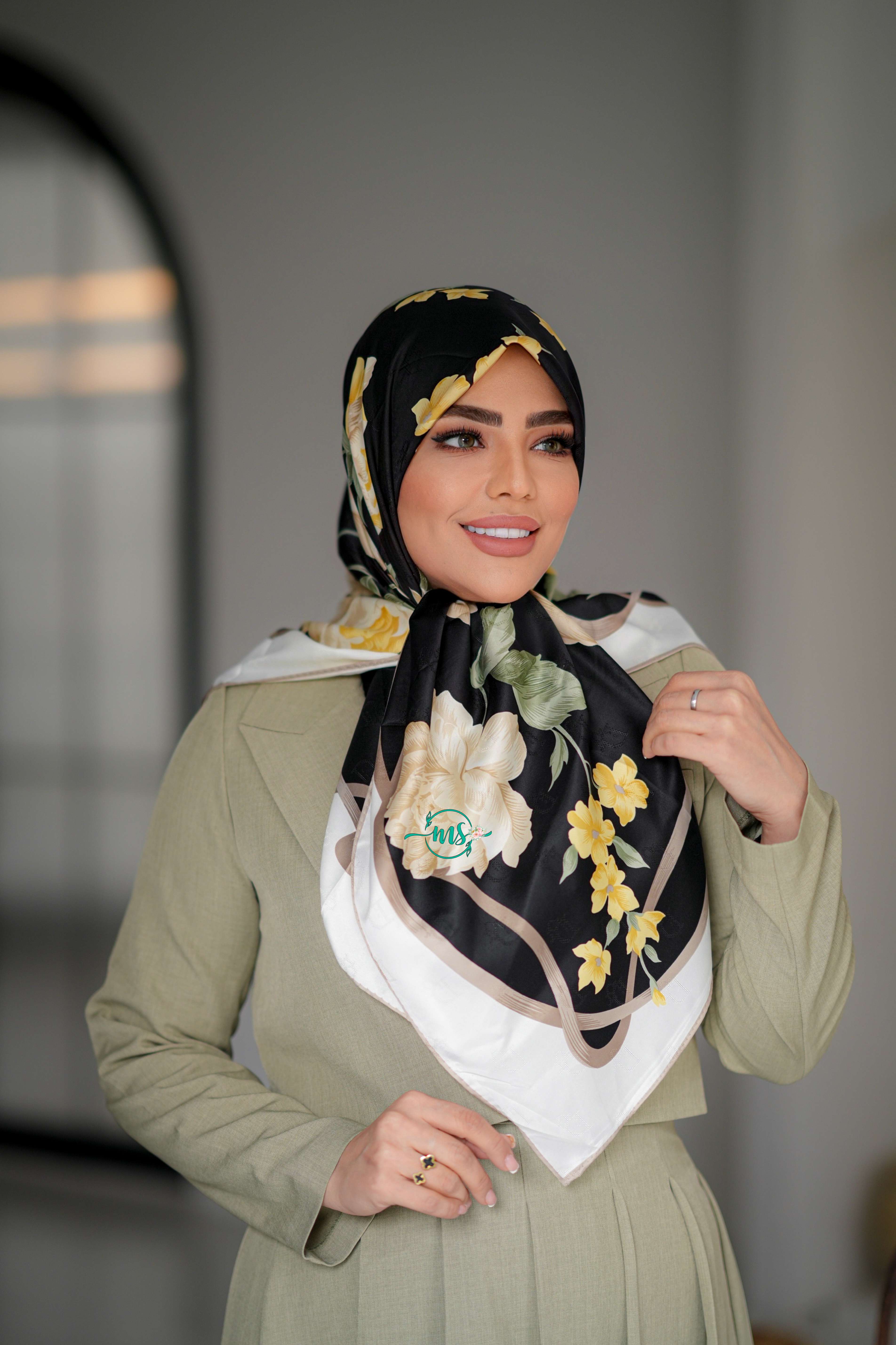 روسری طرح دیور مربعی کرم سبز